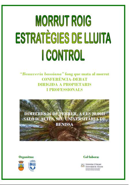 Es tracta d’una conferència – debat, inclosa dins de la campanya de prevenció contra el morrut roig, de la qual, el principal objectiu es la presentació, per part d’un grup d’investigadors de la Universitat d’Alacant, d’un nou tractament contra el morrut, el “Beauveria Bassiana”, un fong entomopatògen que el mata.
