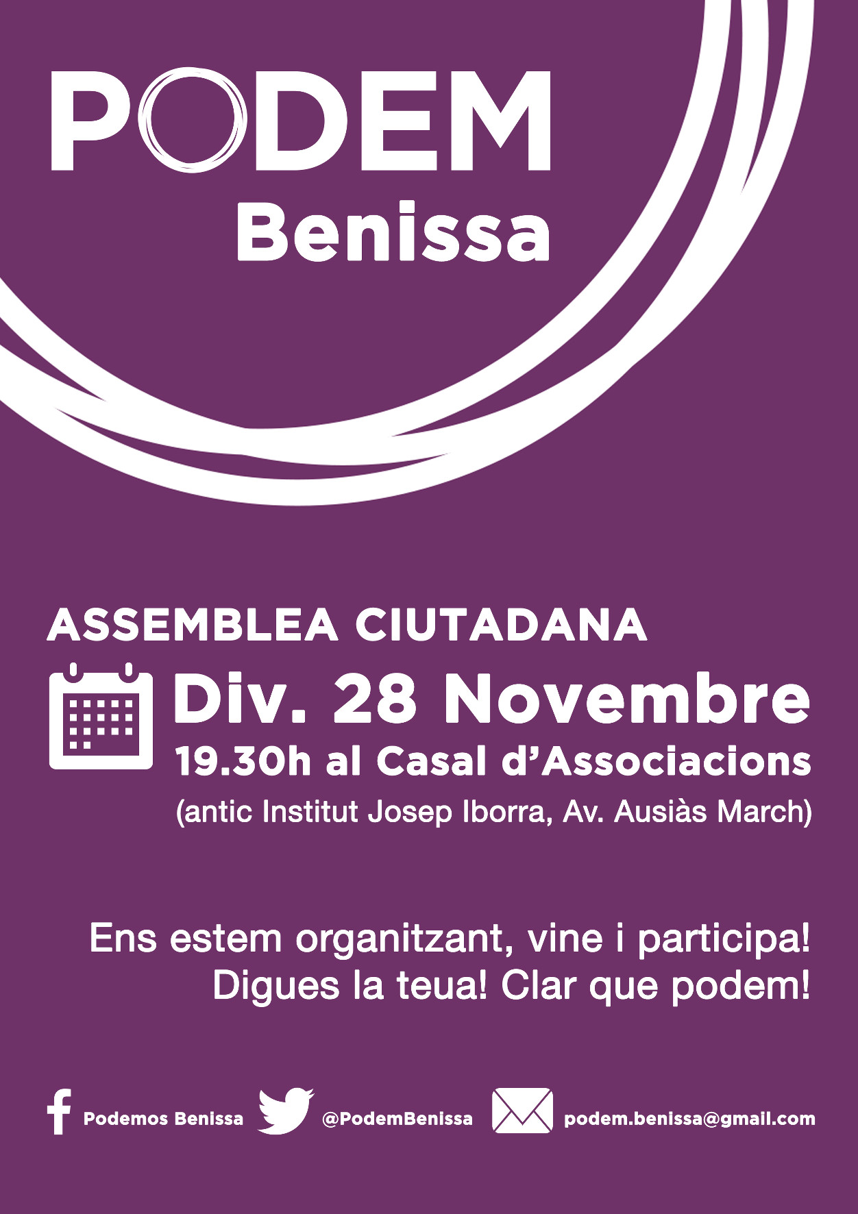 Podemos Benissa ha organitzat la tercera assemblea el divendres que ve, dia 28 de novembre. L’Assemblea es farà a les 19.30h en un lloc diferent, l’Aula 5 del Casal d’Associacions (Antic IES Josep Iborra).