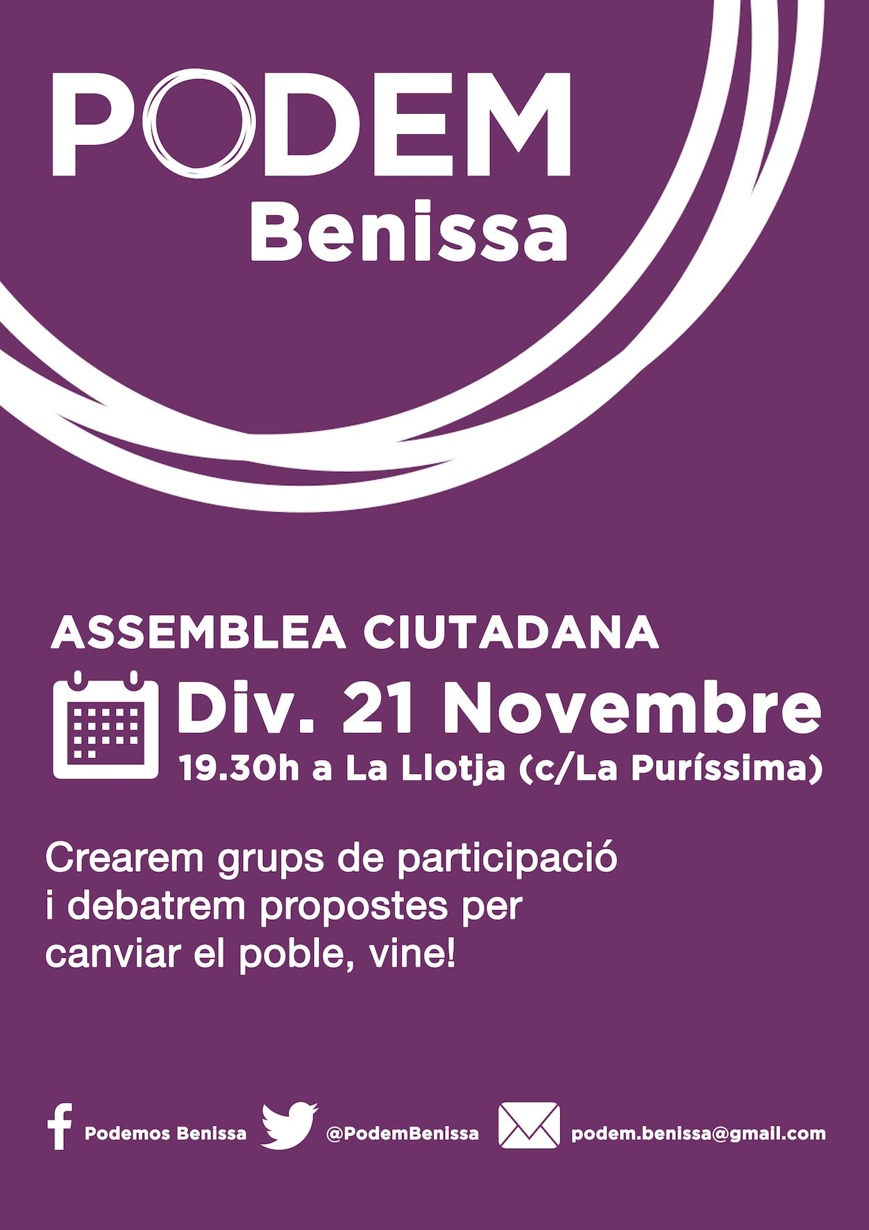 Podemos Benissa ha organitzat per a demà divendres, 21 de novembre, una assemblea participativa en què s’organitzaran i crearan grups de participació ciutadana amb la finalitat de tractar aquelles àrees o problemàtiques que consideren que estan sent desateses o la gestió de les quals creuen deficient.