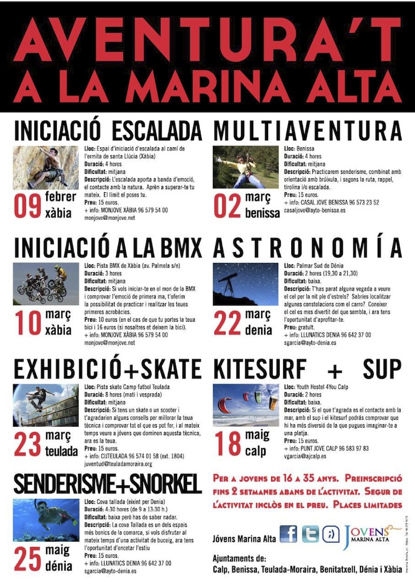 Les activitats, dirigides a joves d’entre 16 i 35 anys, són les següents: iniciació a l’escalada (9 de febrer a Xàbia); Multiaventura (2 de març a Benissa); iniciació a la BMX (10 de març a Xàbia); Astronomia (22 de març a Dénia); Exhibició + Skate (23 de març a Teulada); Kitesurf (18 de maig a Calp) i senderisme més snorkel (25 de maig a Dénia).