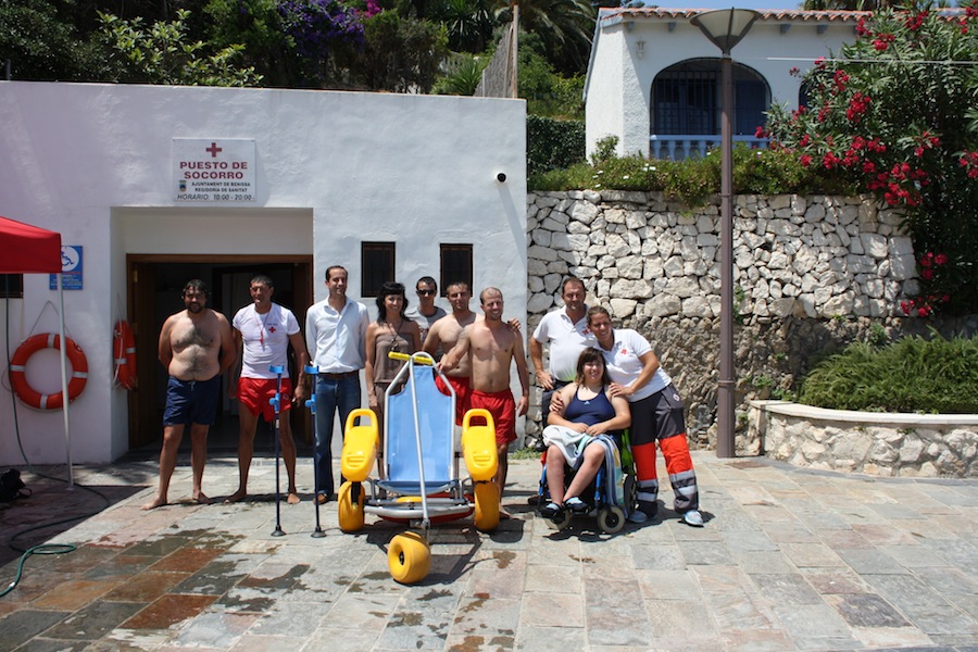 La regidora de Sanitat, Gloria Ivars i el regidor de Medi ambient, Arturo Poquet, es van desplaçar ahir a la platja de la Fustera per a presentar el servei de “cadira amfíbia”, que permetrà que les persones minusvàlides o amb mobilitat reduïda gaudisquen d’un bany, gràcies a l’ajuda dels voluntaris de la Creu Roja.