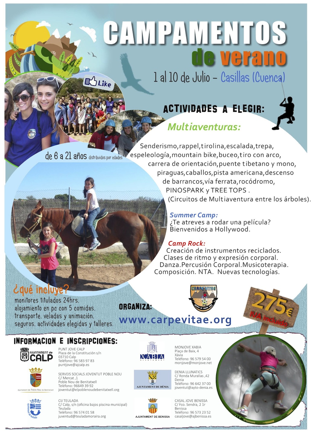 Com cada any les regidories de joventut dels Ajuntaments de Dénia, Xàbia, Poble Nou de Benitatxell, Teulada, Benissa i Calp, aprofitant les vacances d’estiu, organitzen per als xiquets i joves d’entre 6 i 21 anys, un campament d’estiu, concretament de l’1 al 10 de juliol.