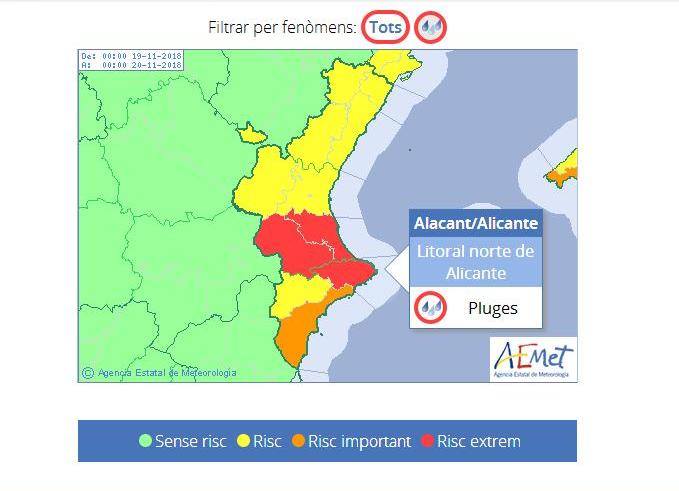 L’alerta roja que ha fixat AEMET per a demà dilluns entre aquesta mitjanit i demà a les 15.00h, amb probabilitat de pluges acumulades de 180 litres per metre quadrat en 12 hores, ha fet que finalment l’Ajuntament de Benissa decidira anular fa uns moments les classes als centres educatius per a demà dilluns. L’alerta continuarà amb nivell taronja, des de les 15.00h fins la mitjanit de demà dilluns amb possibles precipitacions acumulades de 140 litres per metre quadrat en espai de 12 hores per la vesprada.