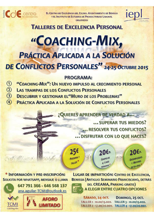 El Centre d’Excel·lència de Benissa i l’IEPL (Institut d’Estudis de Productivitat Laboral) organitzen el taller “Coaching Mix: Pràctica aplicada a la solució de conflictes personals”.