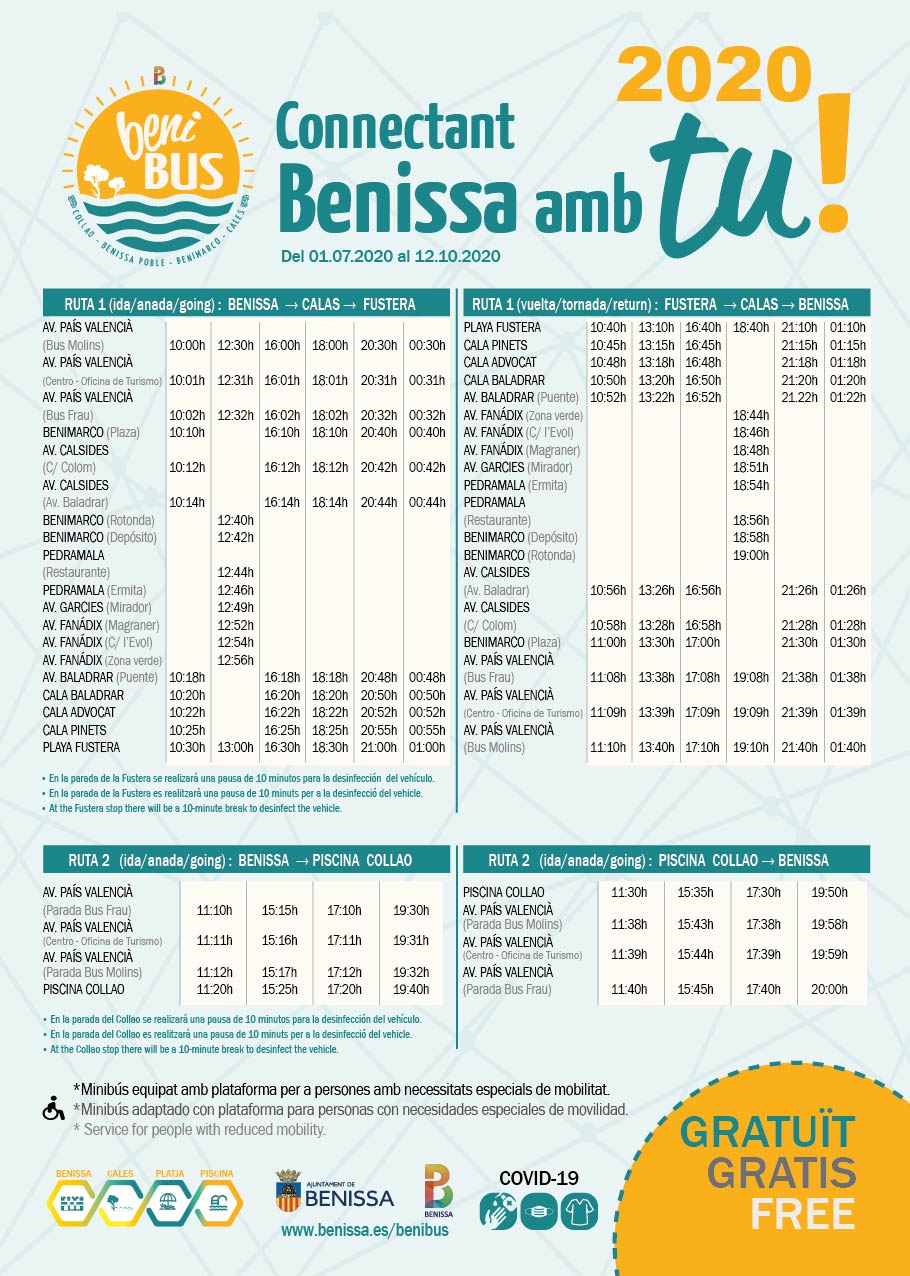 El Benibús torna a oferir enguany el transport públic gratuït entre el centre urbà de Benissa i les cales de Benissa. Així mateix torna la ruta entre Benissa i la piscina pública del Collao.