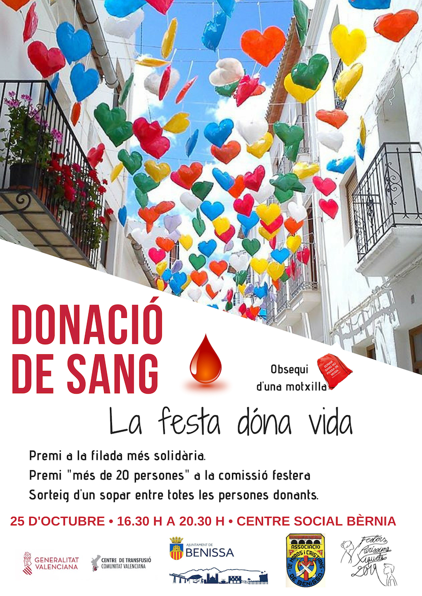 Aquest dijous 25 d’octubre, la ciutadania de Benissa té una cita amb la solidaritat i amb la vida. Es realitzarà una marató de donació de sang “La Festa dóna Vida” al Centre Social Bèrnia de 16.30h a 20.30h. En aquesta marató participaran la Comissió de Festes de la Puríssima Xiqueta 2019 i l’Associació de Moros i Cristians de Benissa.