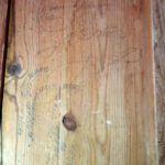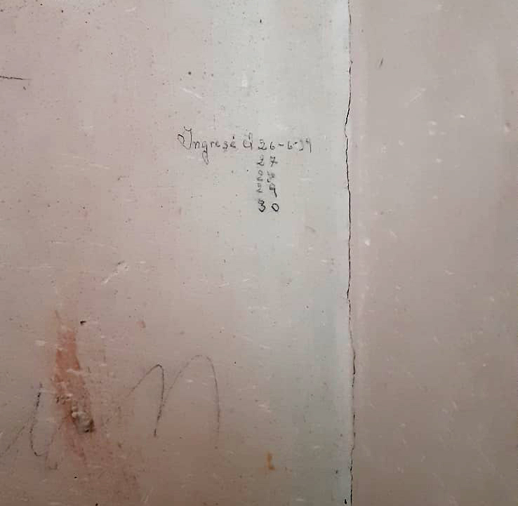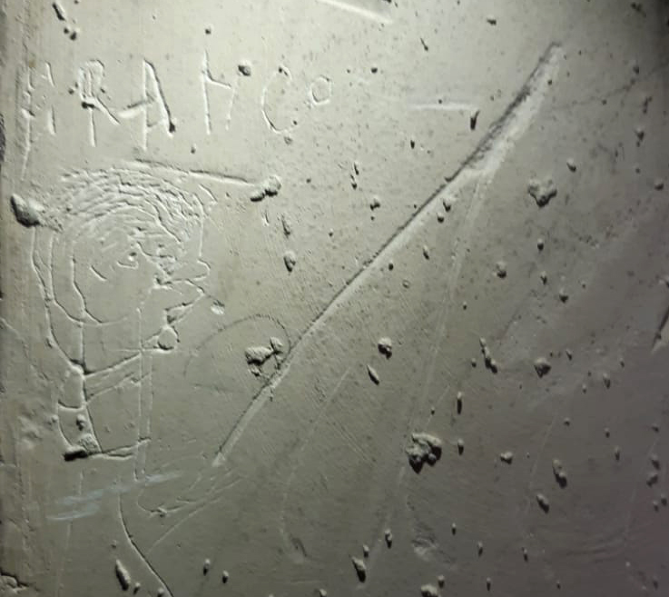 Entre els dibuixos i gravats figuren l’emblema de la Falange, una creu i els comptes o dies en què van estar reclosos els soldats.