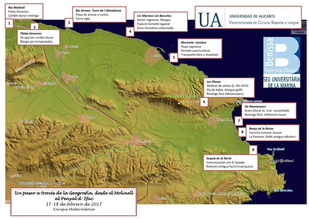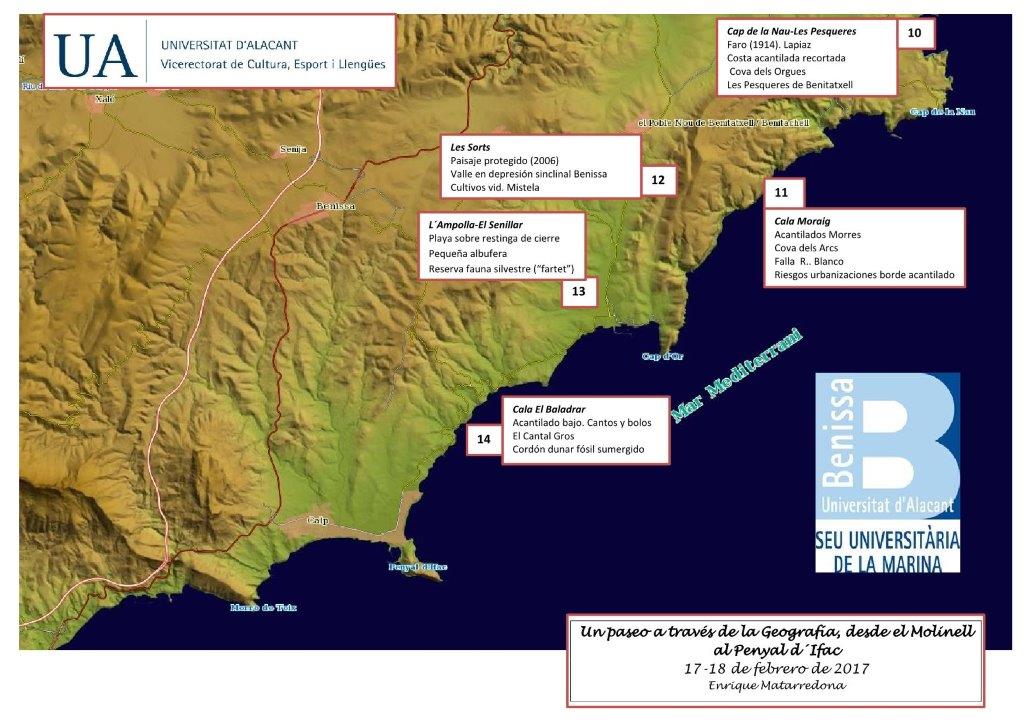 La primera conferència serà el divendres 17 de febrer amb el títol “Un passeig a través del patrimoni geogràfic litoral: des del Molinell al Penyal d’Ifach” i estarà impartida pel professor Enrique Matarredona Coll. Es proposa un acostament al patrimoni natural del litoral de la Marina Alta des de la Geografia Física, per a conèixer els diferents sectors en els quals es divideix l’espai litoral i la problemàtica associada a cadascun d’ells. A més, es donaran a conèixer els conceptes bàsics relacionats amb aquest espai litoral així com els trets identificatius dels diferents sectors. Tot açò per a aconseguir una visió integral de l’espai litoral de la Marina Alta, la seua fragilitat i les amenaces a les quals es veu sotmès davant determinades actuacions antròpiques. La conferència es complementarà amb una eixida pràctica prevista per al dissabte 19 de febrer.