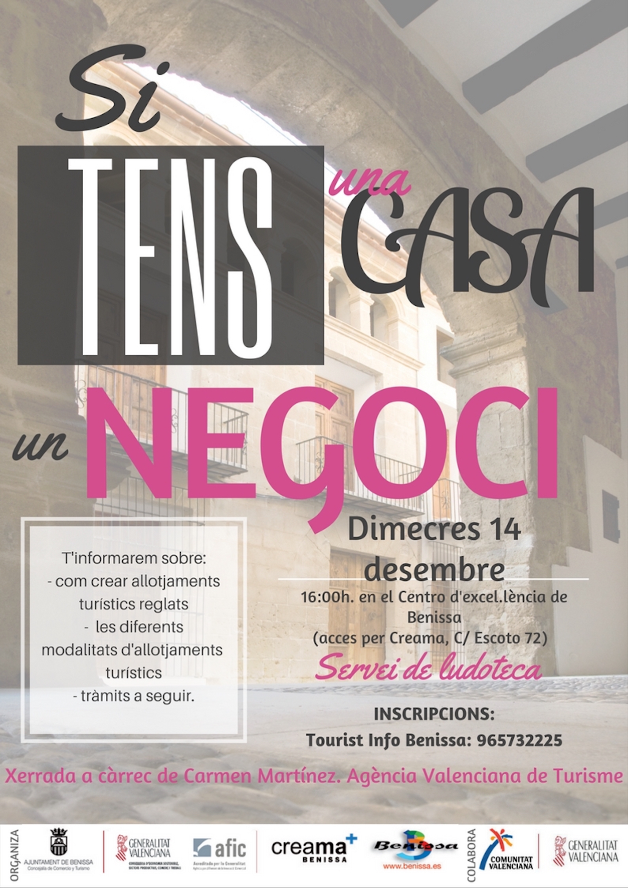 Per açò s’ha organitzat una xarrada informativa al Centre d’Excel·lència de Benissa el dimecres 14 de desembre a les 16.00 en la qual es comptarà amb la presència de la cap del Servei d’Ordenació de l’Agència Valenciana del Turisme, Carmen Martínez Aznar, qui exposarà les diferents modalitats d’allotjaments turístics, la importància de la legalitat dels mateixos, així com els passos a seguir per a tramitar la seua obertura.
