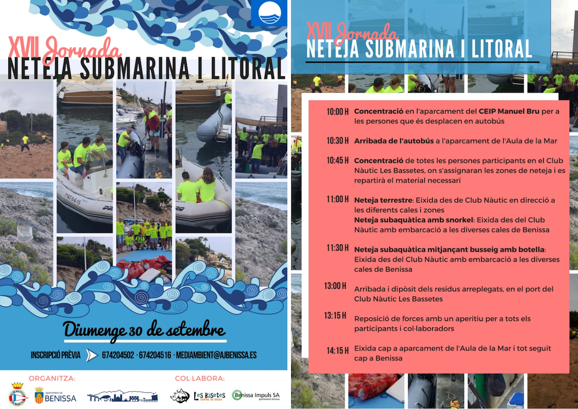 11.30h Neteja subaquàtica mitjançant busseig amb botella. Eixida des del Club Nàutic amb embarcació a les diverses cales de Benissa.