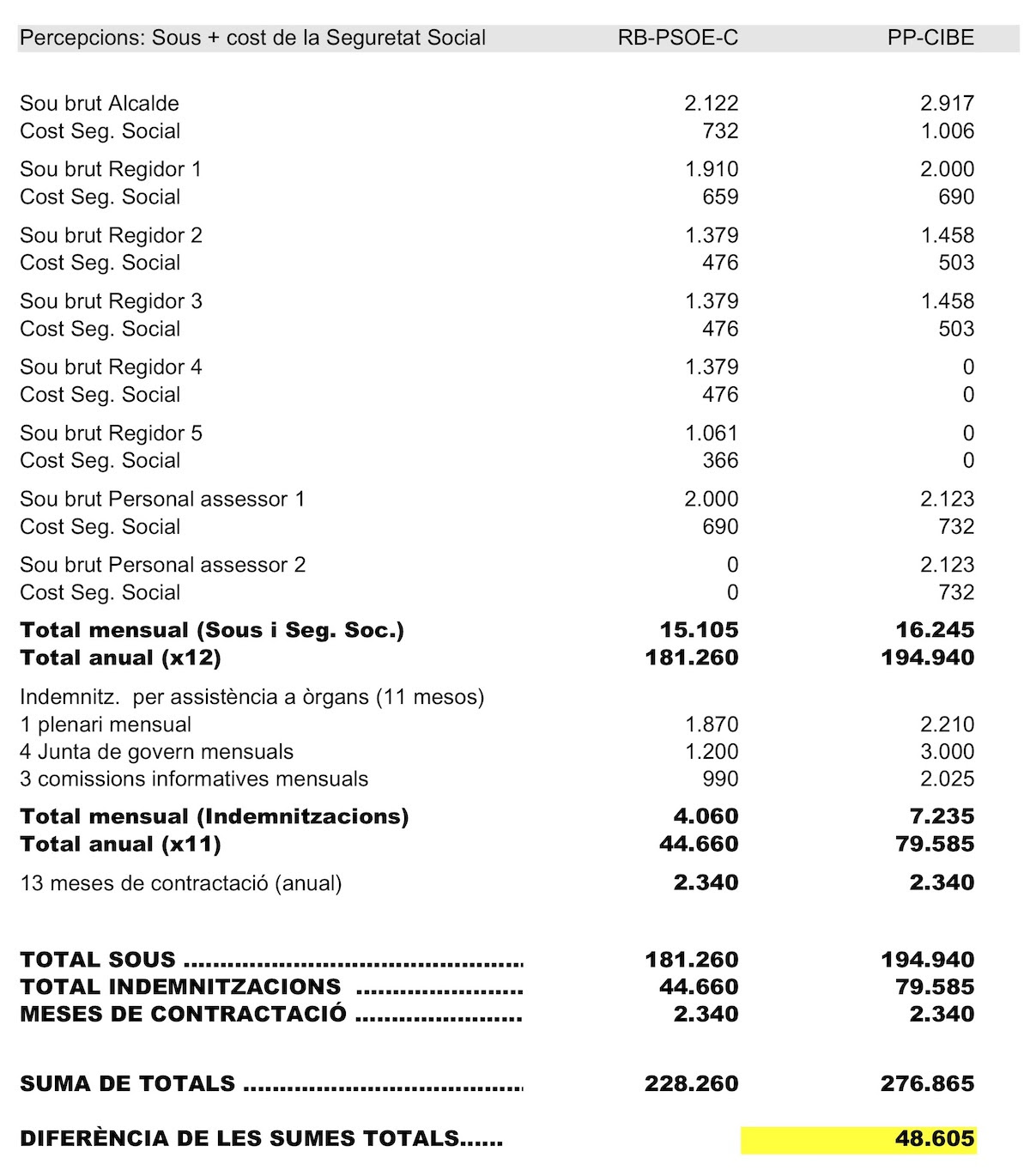Les xifres finals són ben diferents a les anunciades i suposen aquest increment anual de més de 48.000 €, i més de 194.000 € extra per a tota la legislatura, molt lluny de la rebaixa anunciada de 68.000 €.