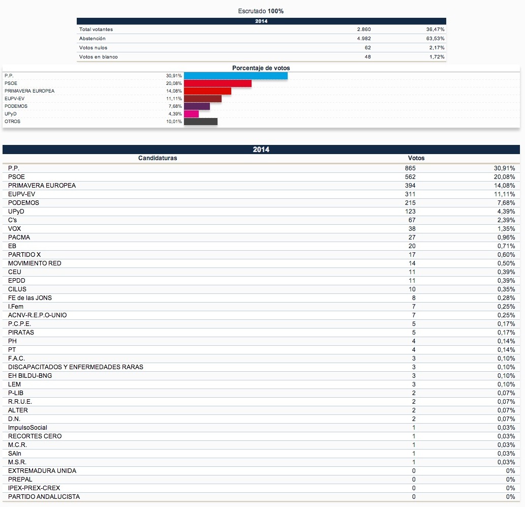 Cal destacar també la forta abstenció d’un 63,53%, un 7,39% superior que la registrada a les europees de 2009.