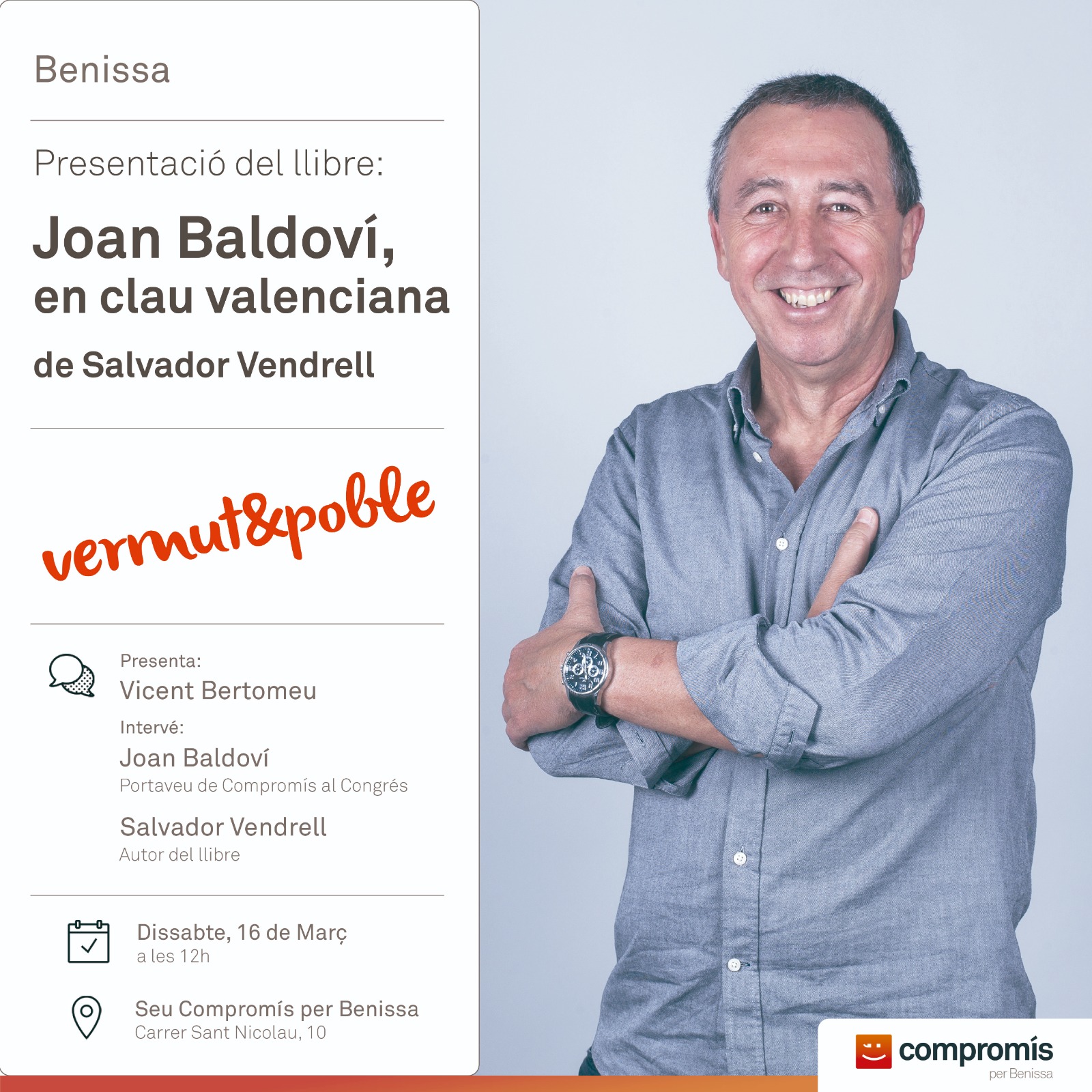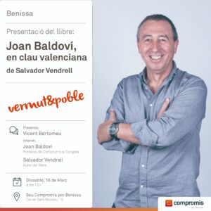 Joan Baldoví, portaveu de Compromís al Congrés de Madrid i candidat al Congrés a les pròximes eleccions generals, visitarà de nou Benissa el pròxim dissabte 16 de març a les 12 del matí per a presentar el seu llibre “Joan Baldoví. En clau valenciana”, publicat per l’editorial Perifèric Edicions i escrit per Salvador Vendrell, qui també participarà en la presentació, a més de Vicent Bertomeu “visa”, membre de la candidatura municipal de Compromís, qui presentarà l’acte que tindrà lloc en la seu de Compromís Benissa, situada al número 10 del carrer Sant Nicolau. Des de Compromís indiquen que “es farà a l’hora del vermut, beguda tan típica nostra, feta per suposat ací i amb un trosset de corfa de taronja valenciana que també podrem gaudir en la mateixa presentació del llibre, en unes jornades que hem anomenat vermut&poble i que tindran continuïtat el pròxim dissabte 11 de maig, aquesta vegada amb el candidat al Parlament Europeu, Jordi Sebastià i el seu llibre, ‘Quadern de l’Europa trista’ com a protagonista.”