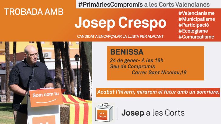 El regidor i portaveu de Compromís per Dénia, Josep Crespo, participarà el pròxim dissabte, 24 de gener, en una trobada a Benissa, en la qual explicarà quins són els seus projectes com a candidat a encapçalar la llista per Alacant a les primàries de Compromís.