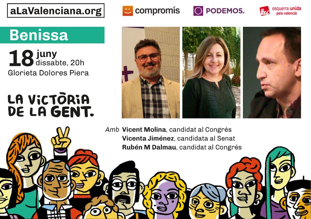 La coalició “A la valenciana”, formada per Compromís, Podem i Esquerra Unida, farà un míting aquest aquest dissabte 18 de juny a les 20.00h a la Glorieta Dolors Piera.