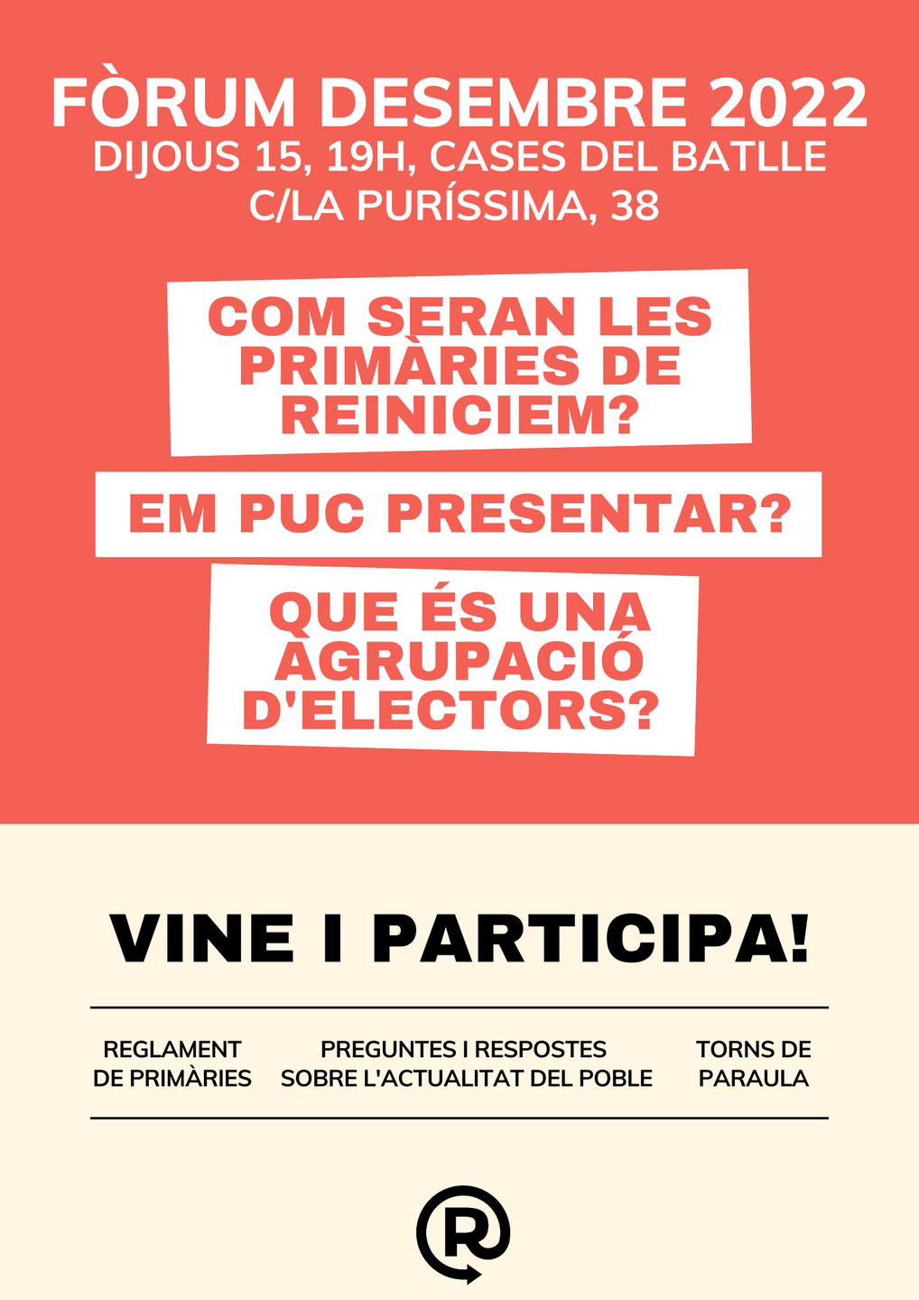 Reiniciem Benissa ha organitzat hui dijous 15 de desembre (19h, Cases del Batlle) un Fòrum Ciutadà per a parlar de les Primàries de cara a les eleccions municipals de 2023, així com de diversos temes de l’actualitat del poble.