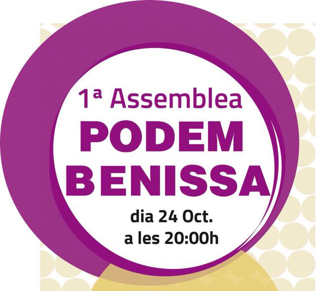 Podemos Benissa ha anunciat per a demà divendres 24 d’Octubre la seua primera assemblea al municipi. L’acte tindrà lloc a les 20.00h a la Sala del Consell (C/ Puríssima).