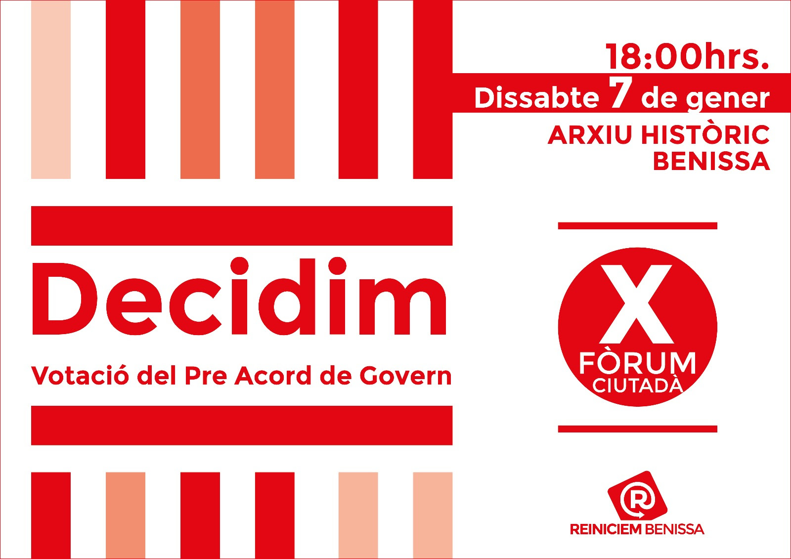 La plataforma ciutadana Reiniciem Benissa celebrarà demà dissabte 7 de gener un Fòrum Ciutadà urgent per a decidir si aprova o no el preacord de govern al qual han arribat Reiniciem Benissa, PSOE i Compromís després de les negociacions i converses de les últimes setmanes.