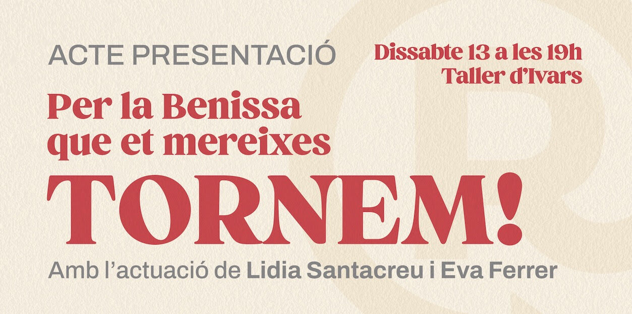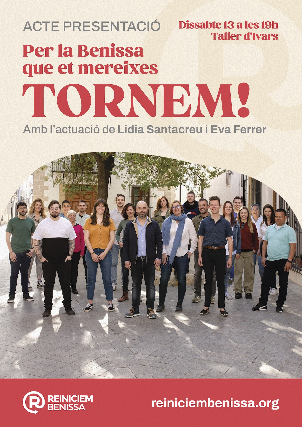 L’agrupació d’electors, a més, estrenarà en exclusiva el vídeo electoral en l’acte d’aquest dissabte 13 i comptarà amb l’actuació de les benisseres Eva Ferrer i Lídia Santacreu.