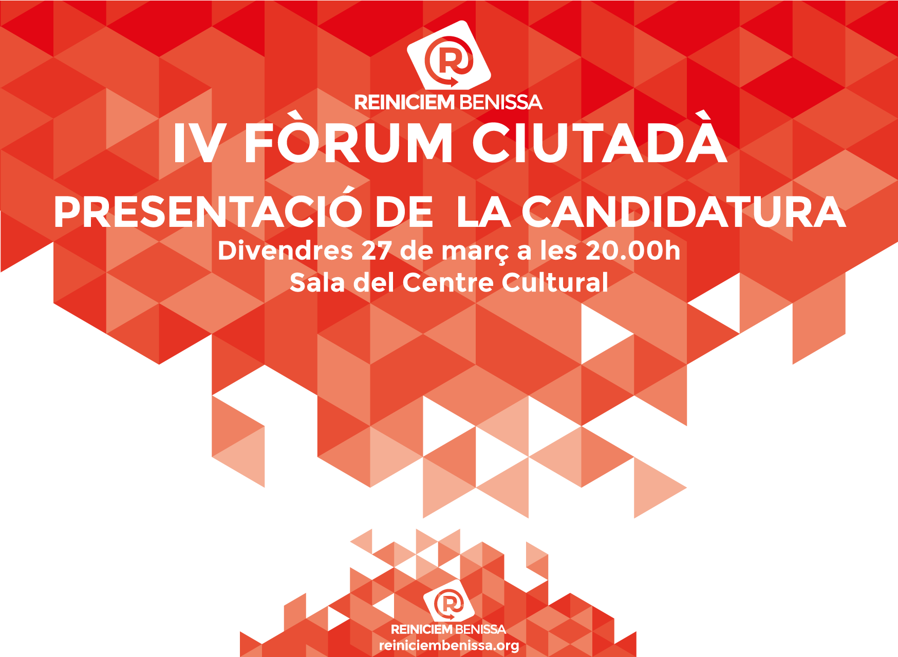 La presentació i votació de la llista electoral de Reiniciem Benissa serà el principal punt de l’ordre del dia del “IV Fòrum Ciutadà”. La trobada se celebrarà hui divendres 27 de març a les 20:00 hores al Saló d’Actes del Centre Cultural de Benissa.
