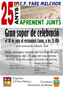 L’Escola Pare Melchor, que enguay celebra el seu 25 aniversari, ha organitzat per al divendres 18 de juny a les 21.30h un gran sopar al Restaurant Canor al qual estan convidats tots els que han format part de la història del centre: mestres, alumnes, pares, personal de serveis, etc.