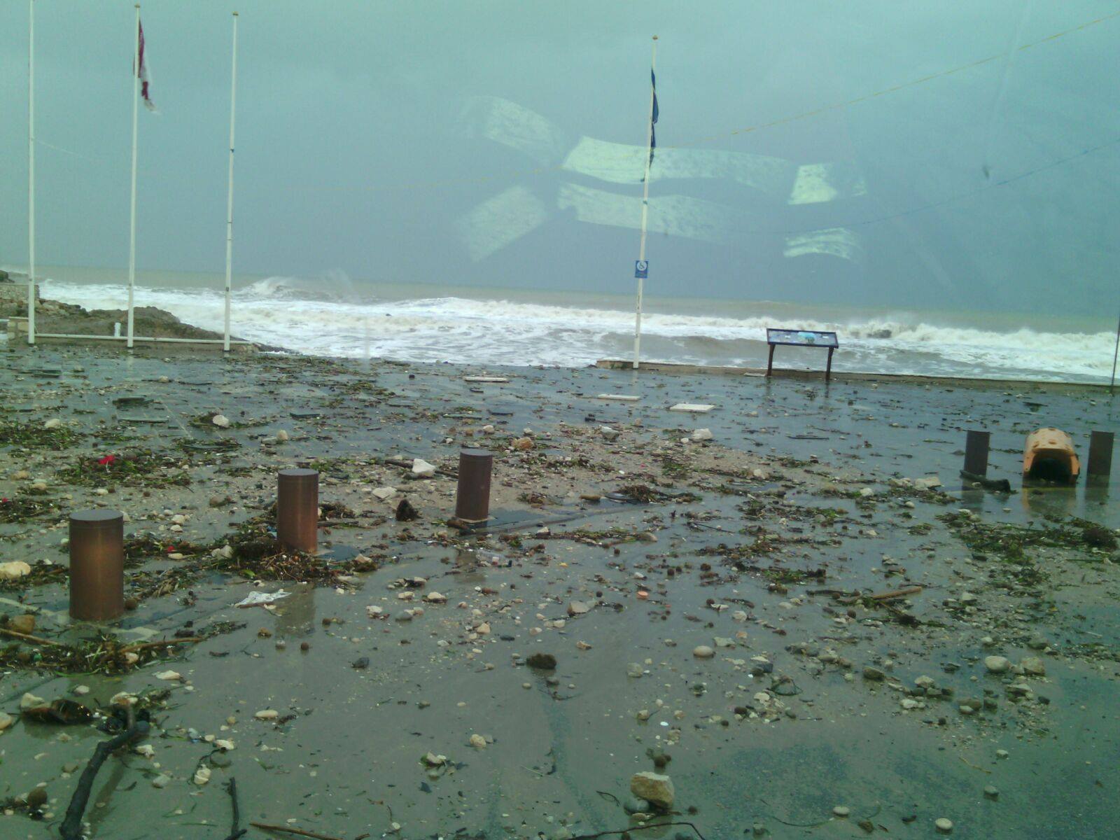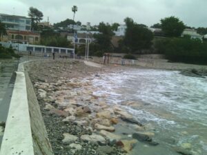 El temporal que està patint Benissa aquests dies, amb vents de fins a 100 km/h, ha afectat greument la platja de la Fustera. La mar s’ha engolit bona part de l’arena de la platja, ha causat destrosses i ha llaçant pedres al passeig.