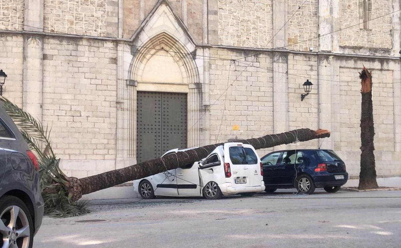 El vent ha produït la caiguda d’una de les palmeres de l’aparcament de la Glorieta Dolors Piera, davant l’església. L’impacte ha esclafat una furgona que s’hi trobava estacionada i ha ocasionat desperfectes menors en altres vehicles. Els bombers del parc de Benissa, juntament amb la policia local i altres operaris municipals han retirat l’exemplar. L’Ajuntament ha anunciat en xarxes que aparentment la palmera no es trobava afectada per cap fong, però que s’estudiaria el cas i s’anava a perimetrar la resta de palmeres per a evitar riscos.