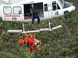 Però el terreny feia presagiar una evacuació molt complicada i va ser necessari mobilitzar l’helicòpter de la Diputació per a transportar el ferit a terra ferma. Bruno R. va ser estabilitzat amb un collar ortopèdic i col·locat en una llitera que els bombers van enganxar amb cordes per a hissar-la des de l’aire. La complicada maniobra va mantenir en suspens totes les forces de seguretat i alguns curiosos que no podien creure que l’home estiguera viu.